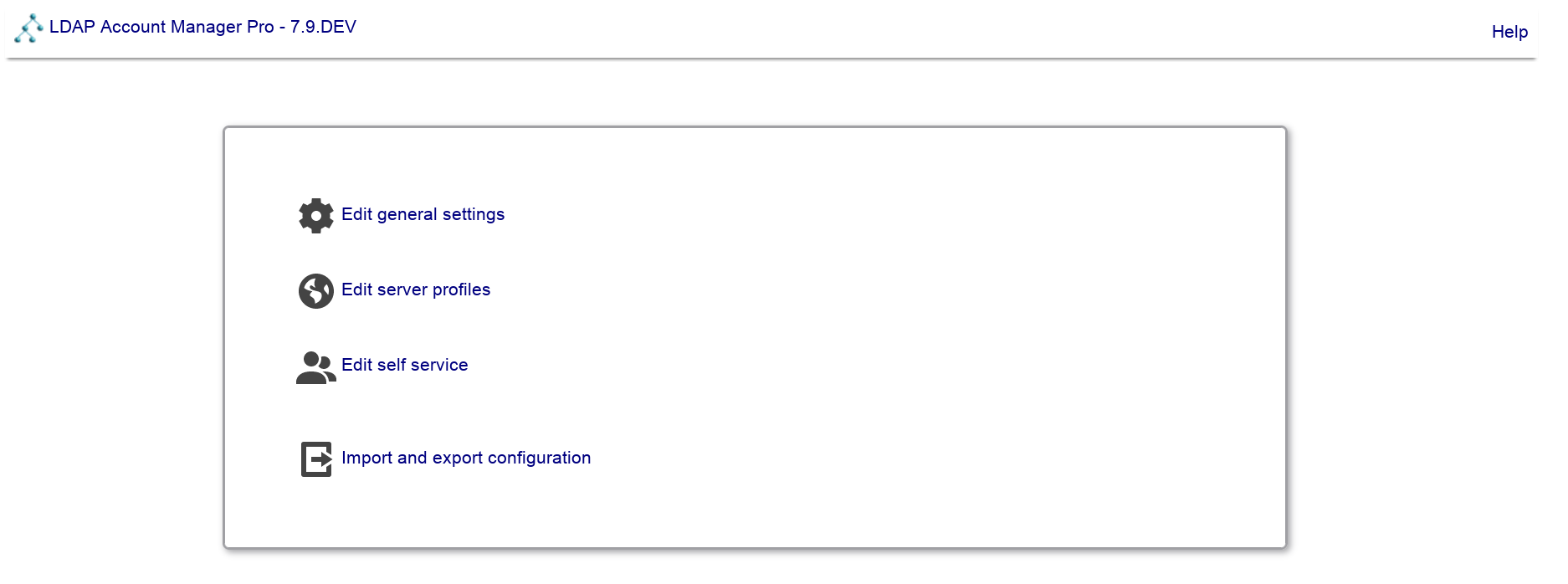 Here you can change LAM's general settings, setup server profiles for your LDAP server(s) and configure the self service (LAM Pro). You should start with the general settings and then setup a server profile.