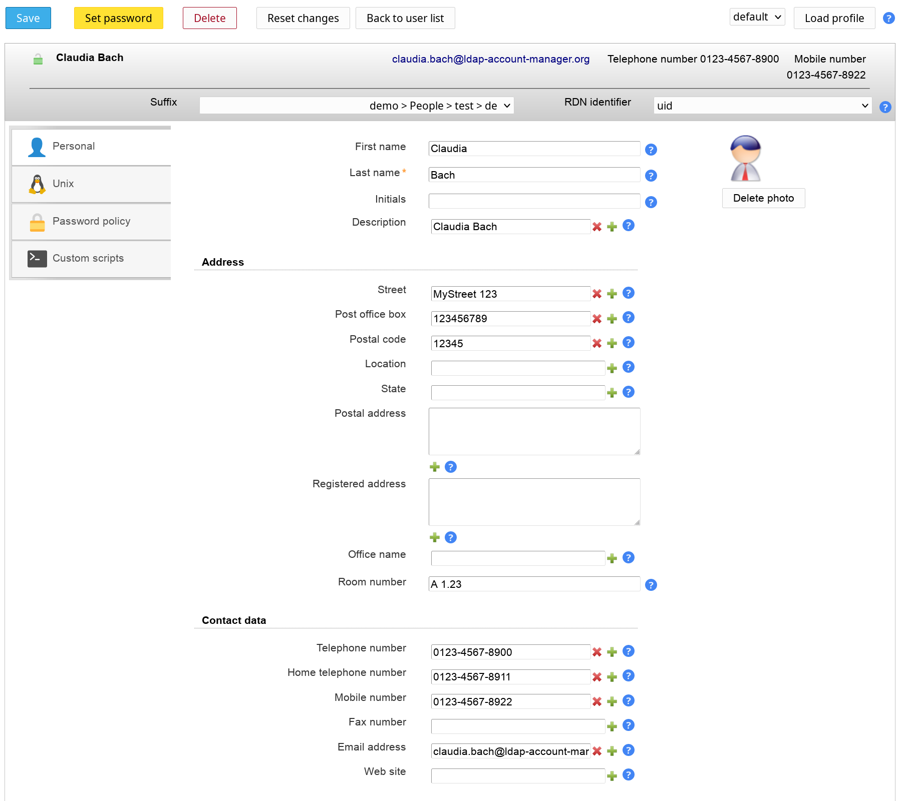 When you select to edit an entry then LAM will show all its data on a tabbed view. There is one tab for each functional part of the account. You can set default values by loading an account profile.