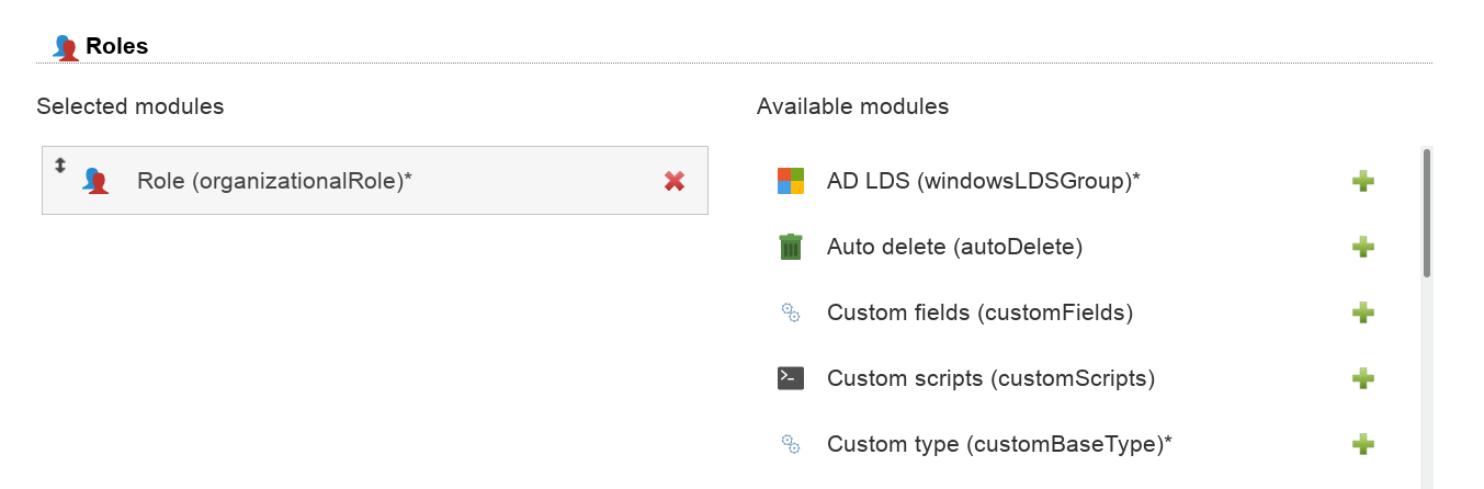 This module manages roles via the organizationalRole object class. There is also a user module to manage memberships on the user edit page.