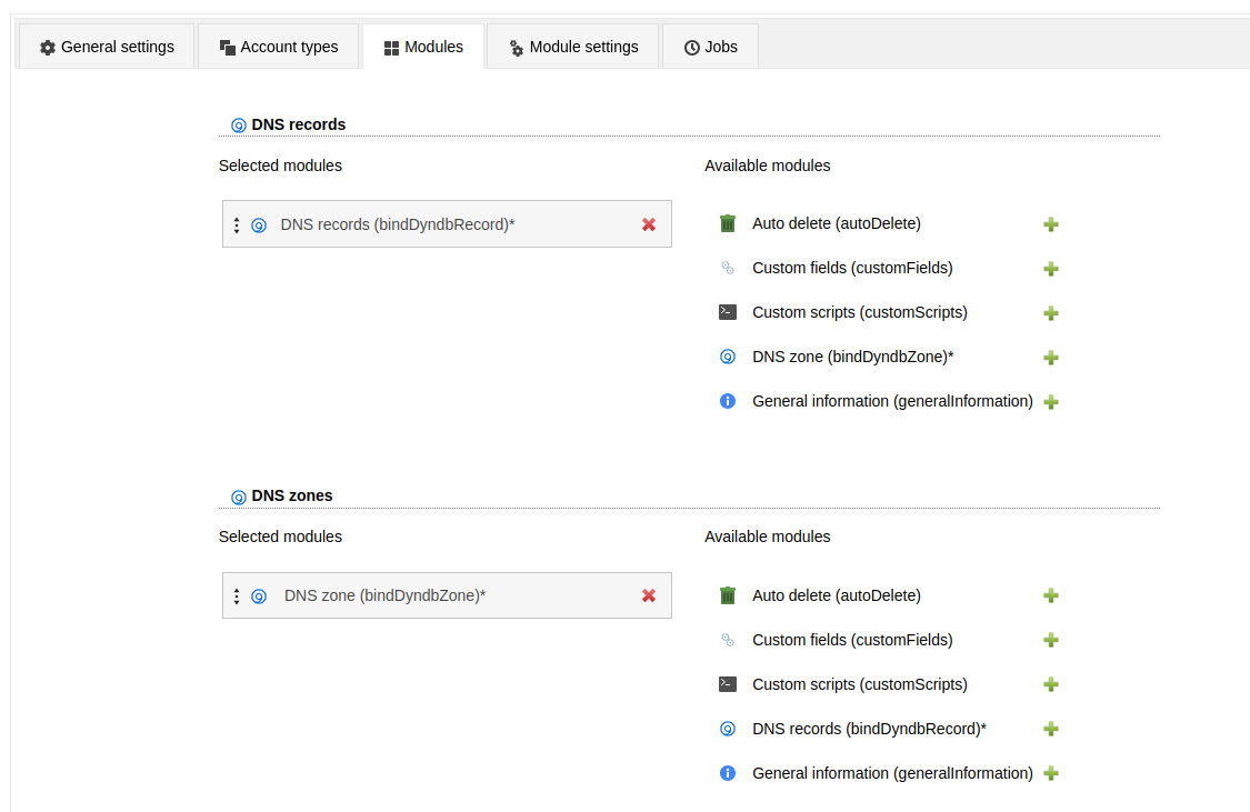 Next, switch to the modules tab. Here, select DNS records for your record type and DNS zone for your zone type. Then you can save the server profile and login to LAM.