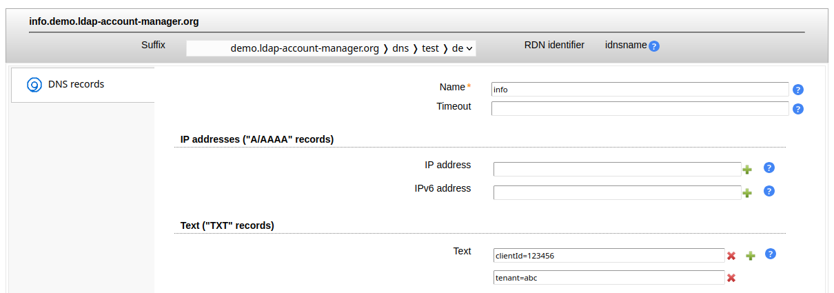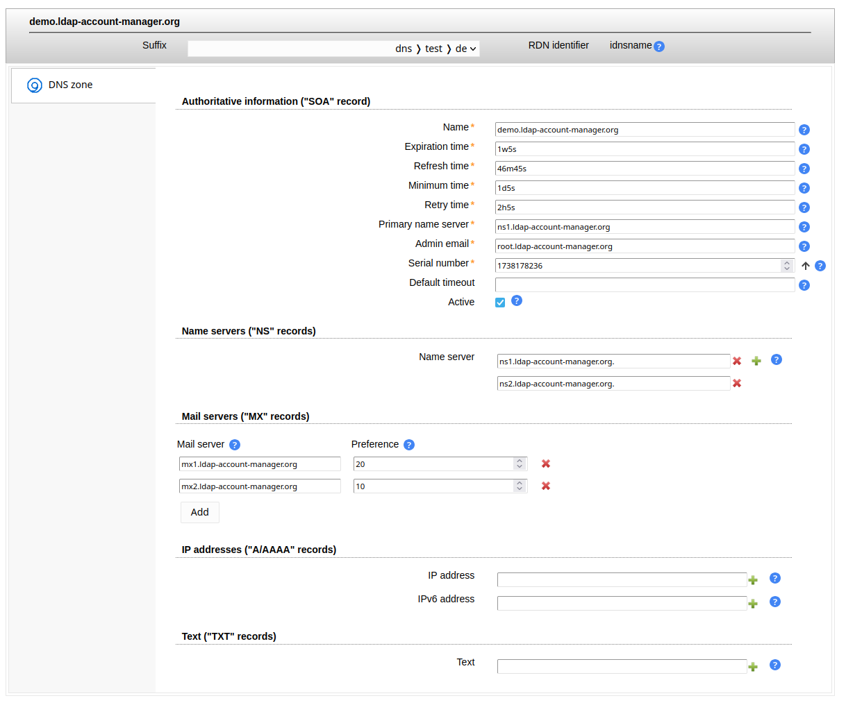 The bind-dyndb-ldap plugin for Bind allows you to manage DNS entries in LDAP. Please install the bind-dyndb-ldap schema file on your LDAP server. It is part of the bind-dyndb-ldap download. LAM Pro can manage DNS zones and the following record types: