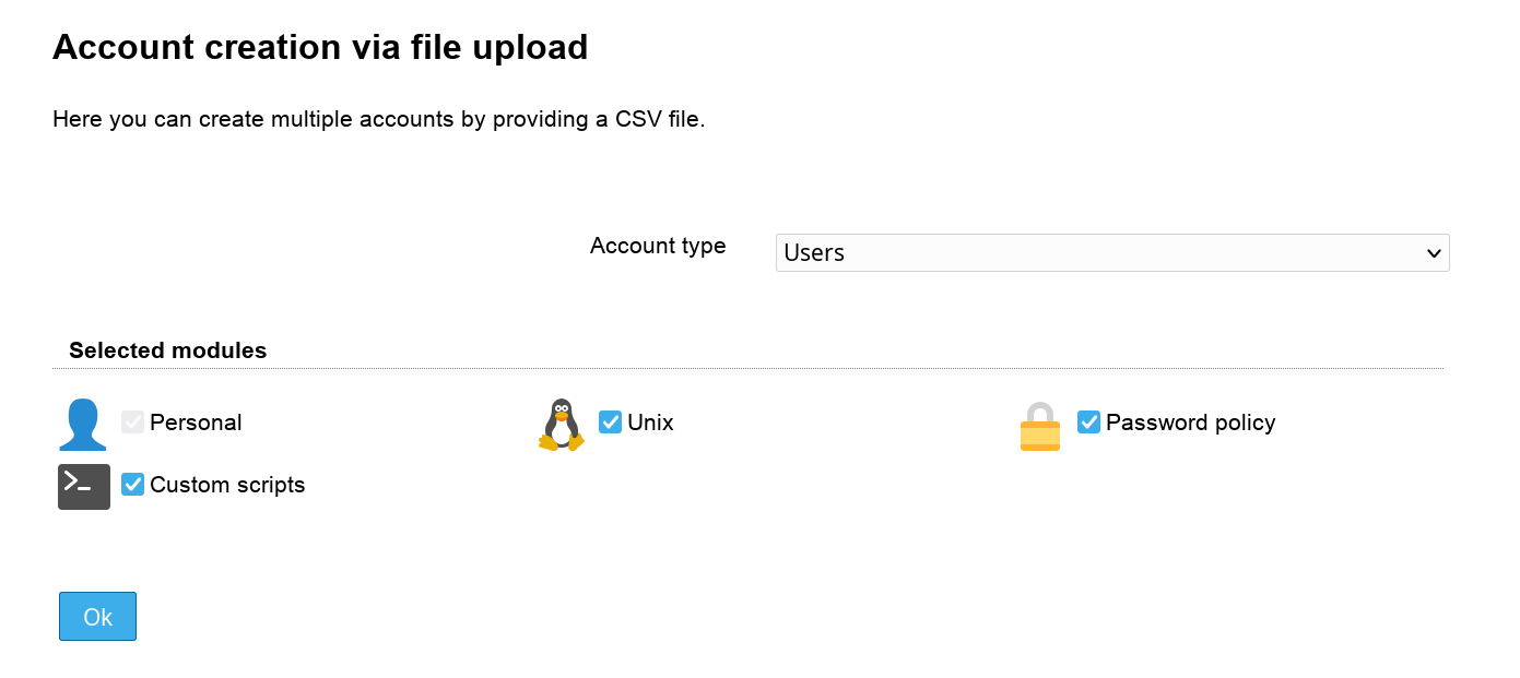 LAM will read a CSV formatted file and create the related LDAP entries. Please check the data in you CSV file carefully. LAM will do less checks for the file upload than for single account creation.