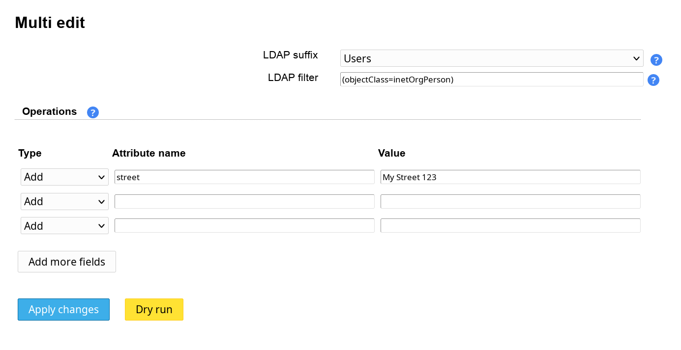 This tool allows you to modify a large list of LDAP entries in batch mode. You can add new attributes/object classes, remove attributes and set attributes to a specific value.